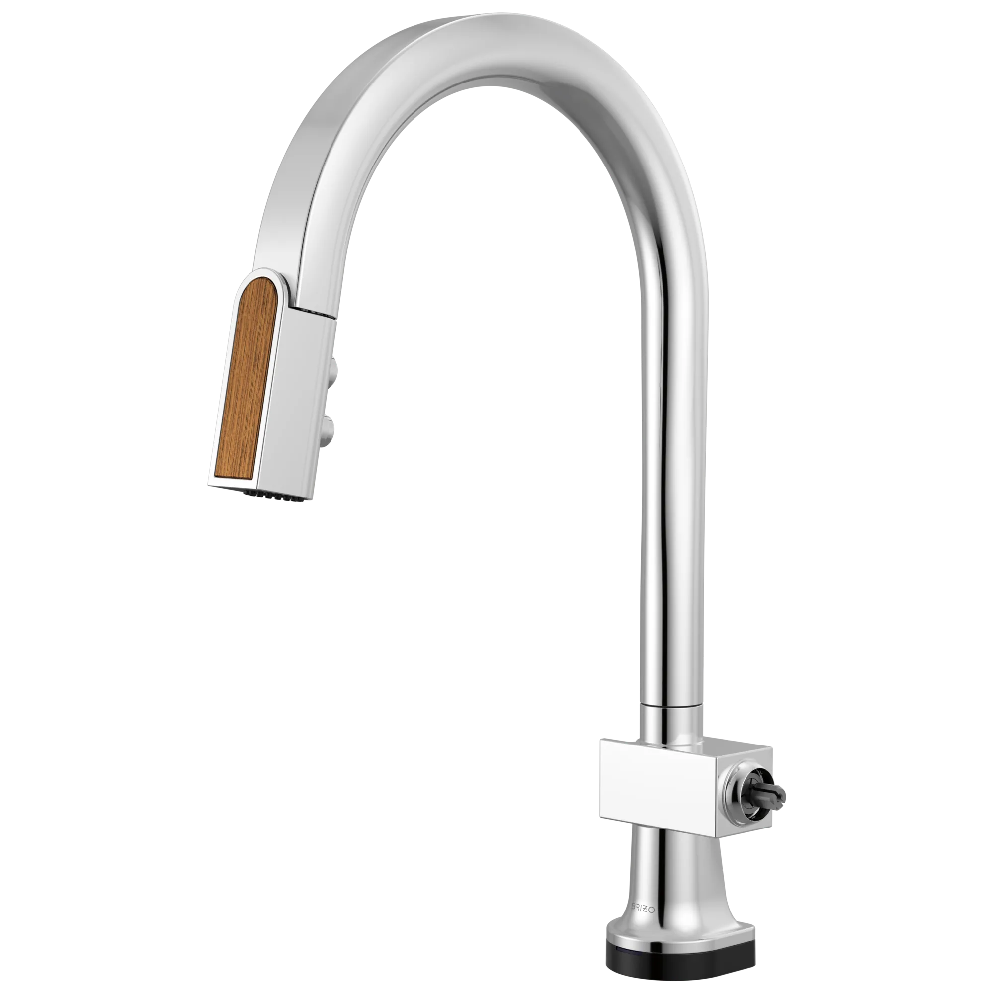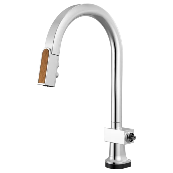 64022LF-PCWDLHP Polished Polished Chrome / Teak Wood Frank Lloyd Wright SmartTouch Pull-Down Kitchen Faucet with Arc Spout and Wood Wand – Less Handle
