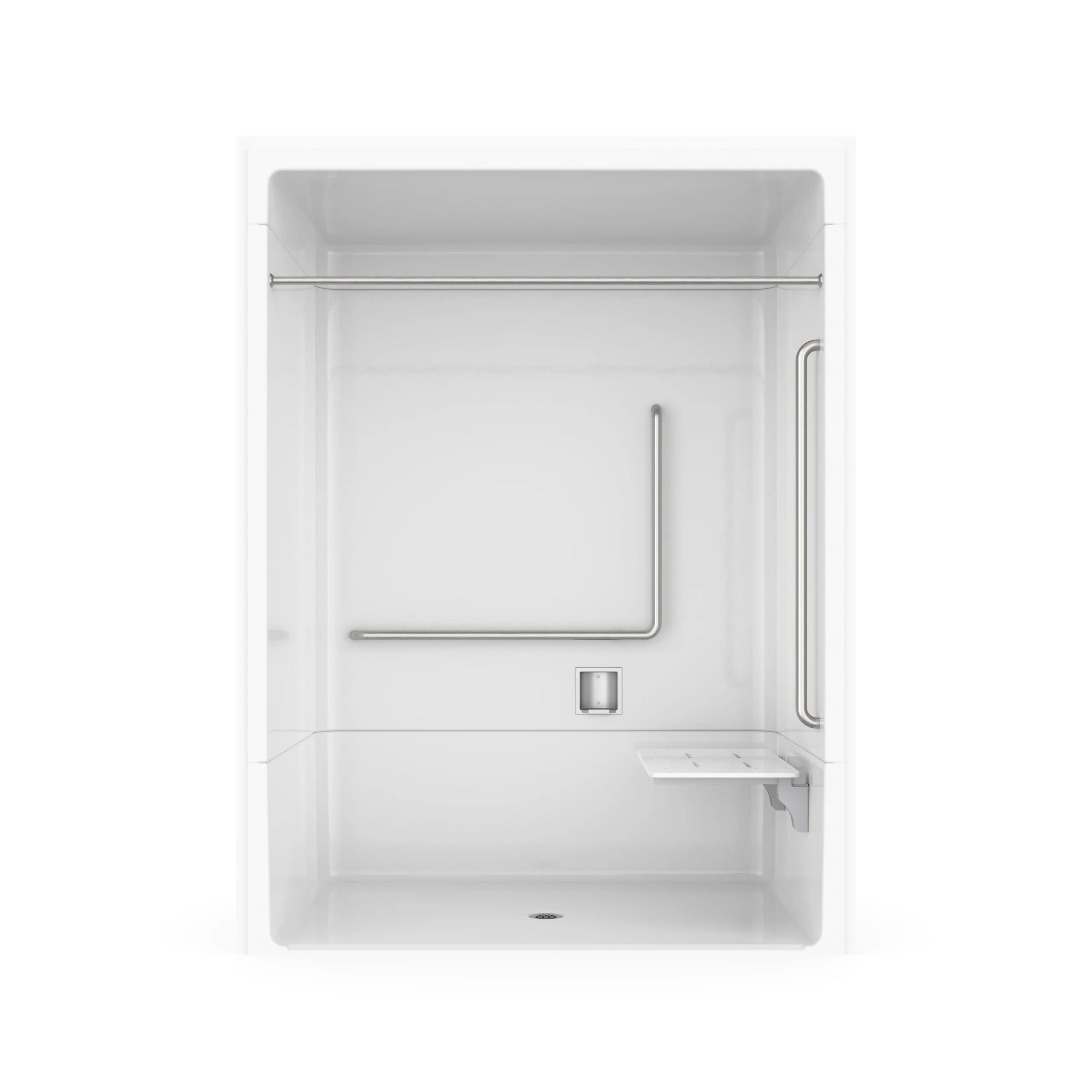Banff BFS-6036A – NBC Alberta Compliant Acrylic Alcove Center Drain Beveled Threshold Three-Piece Shower in White with Right Rectangular Naugahyde Seat