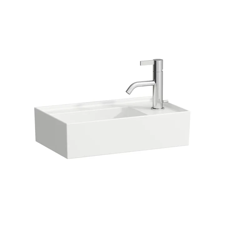 Small washbasin, tap bank right, with concealed outlet, w/o overflow, wall mounted
