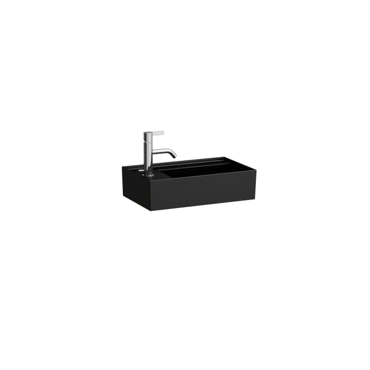 Small washbasin, tap bank left, with concealed outlet, w/o overflow, wall mounted