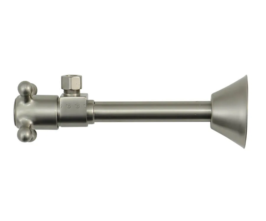 This angle sweat valve is traditionally styled with a cross handle. Includes 5″ sweat extension and 11/16″ bell flange 1/2″ Copper Sweat Inlet x 3/8″ O.D. Compression Outlet